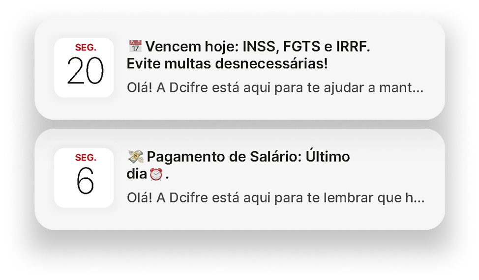 Chega de preocupações com prazos! Com a Dcifre, você garante que seus impostos estejam sempre em dia, evita multas e otimiza seu tempo para focar no crescimento estratégico do seu negócio.